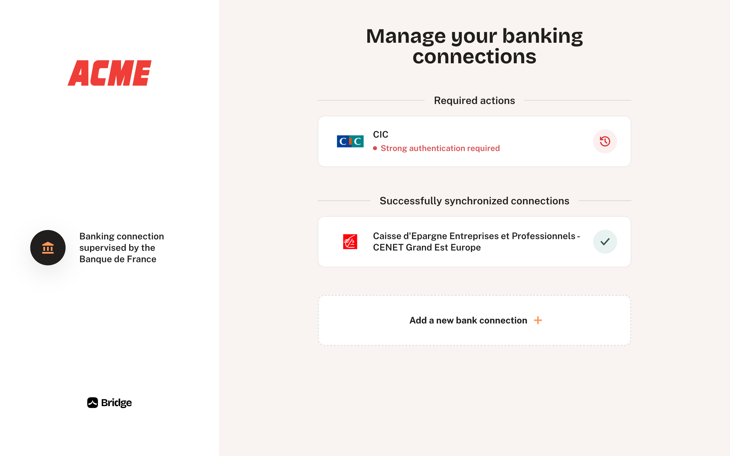 Technically, this acts as a wrapper around the Connect Session. It generates a link to a frontend view where Bridge centralizes item management, status reporting, and maintenance actions, significantly reducing the integration effort on your side.
